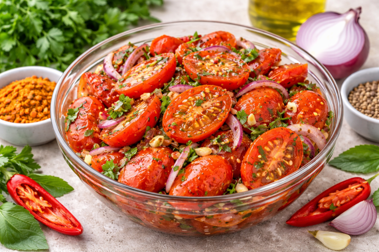 Острая закуска: сочные помидоры с красным луком по-корейски