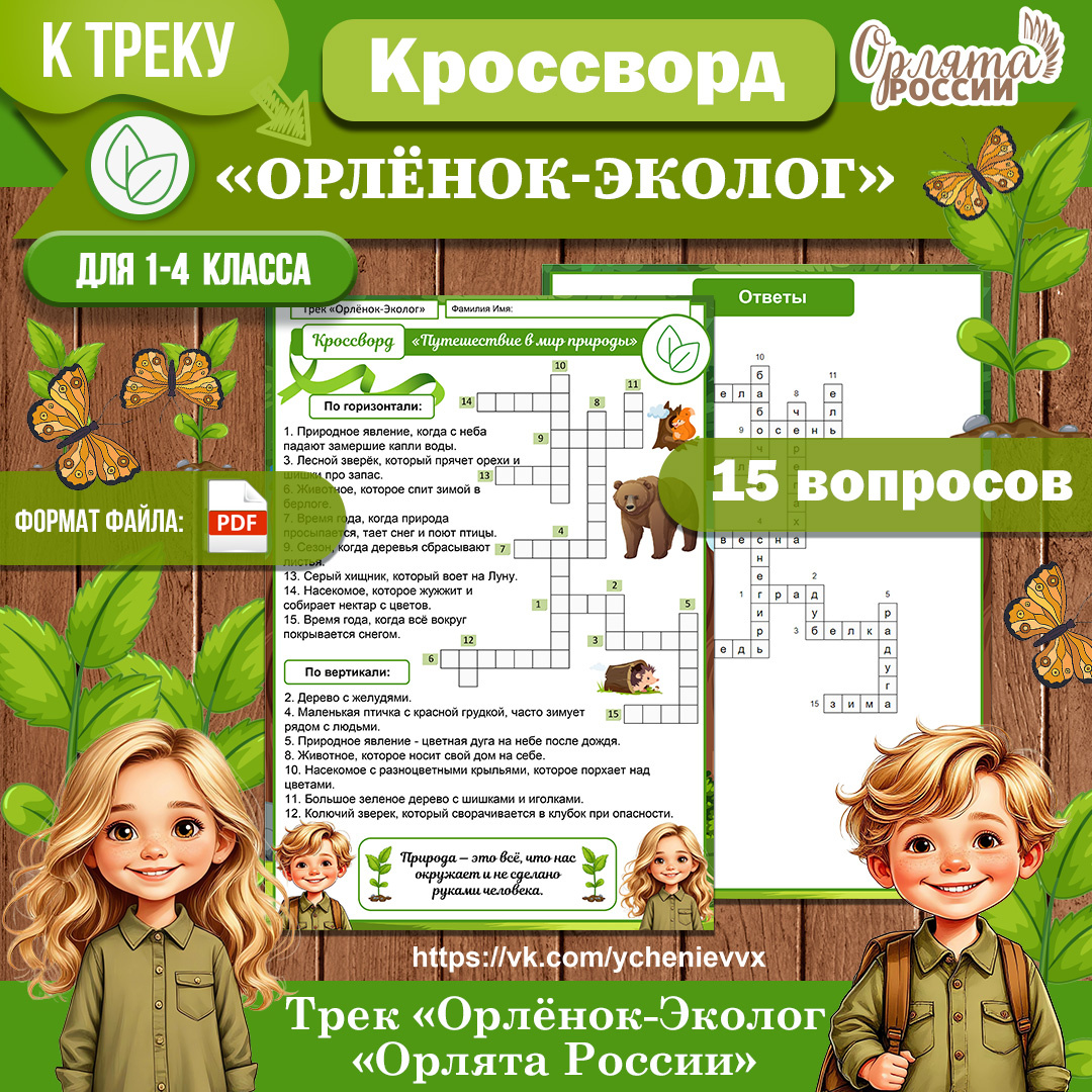 Хотите разнообразить занятия по треку «Орлёнок‑Эколог» программы «Орлята России» и увлечь школьников изучением окружающего мира? Предлагаю вам скачать красочный кроссворд «Путешествие в мир природы» — компактное и эффективное дидактическое пособие для внеурочной деятельности! Этот кроссворд можно скачать здесь.