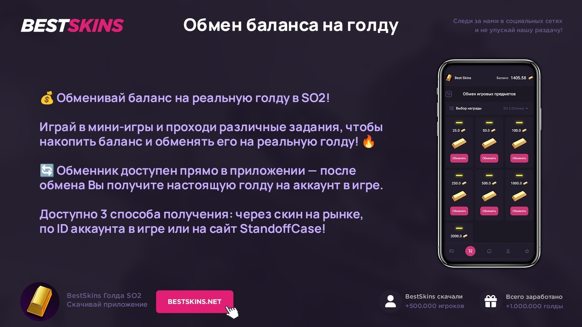 Выводи голду по ID, скину или на StandoffCase.pro 💼 Обычно — 5–120 мин, но иногда дольше ⏳ ⚡ Проверь, возможно ли вывести сейчас! 📲 Скачать - https://bestskins.net