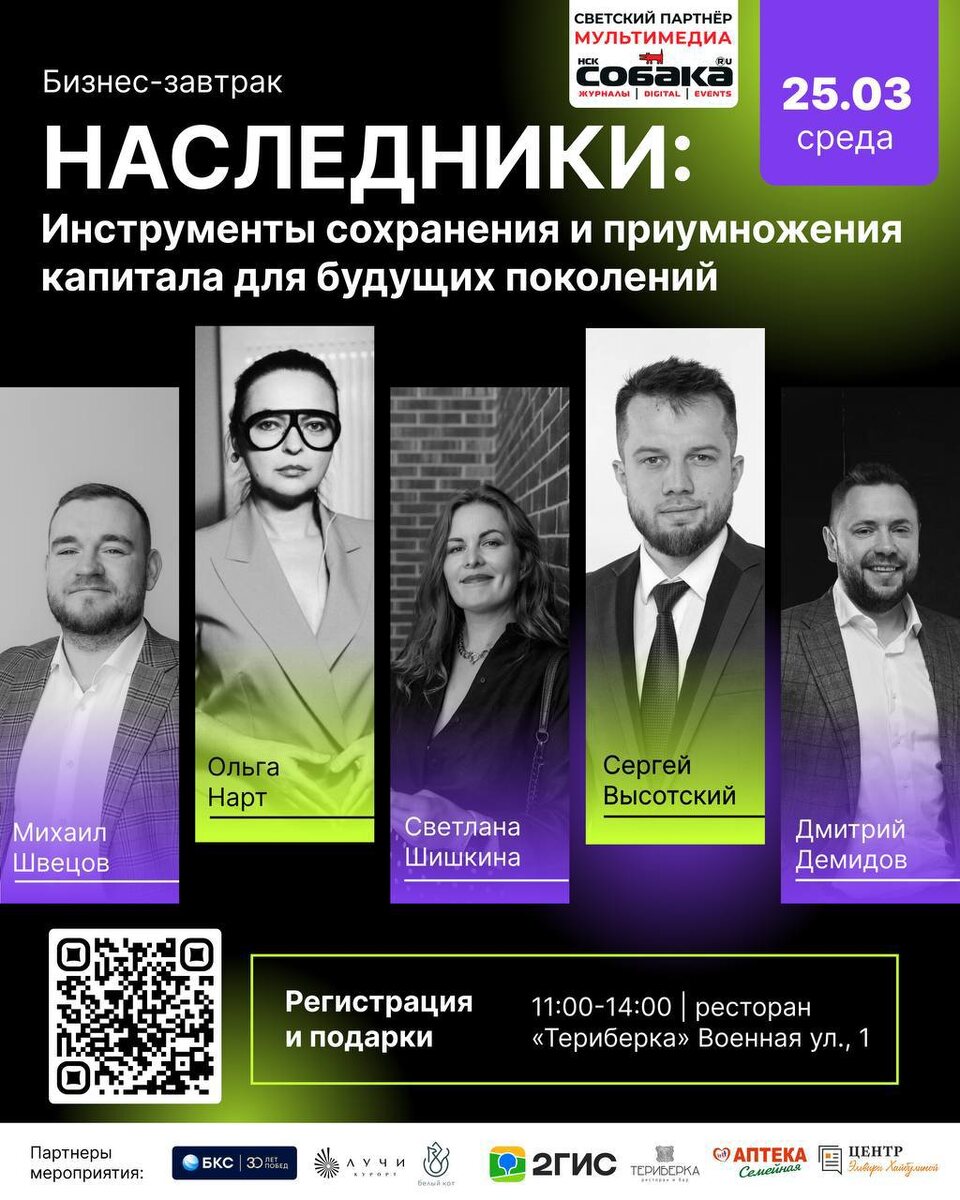 Приглашаем на мероприятие, которое уже будет через 2 дня Бизнес-завтрак Сибири: ⬆️ ⬆️⬆️⬆️⬆️⬆️⬆️⬆️⬆️ Подписчикам канала подарки 💵 Наследники - инструменты сохранениям приумножения капитала для будущих поколений. Дата : 25 марта Время : 11:00 до 14:00 Место: Ресторан Териберка - Военная, 1 Спикеры ✅ Хедлайнер - Светлана Шишкина - Финансовый советник по инвестициям в недвижимость. Как создать жизнь мечты , создать пассивный доход и передать его будущему поколению. ✅Ольга Нарт - Заместитель генерального директора Де Люкс Курорта на черноморском побережье ✅Михаил Швецов - соавтор книги "Наследник", отельер 📌 Какие объекты самые интересные для инвестиций в мире. 📌 Узнайте как инвестировать в Недвижимость : Таиланд, Дубай, Турция , Россия 📌 Получите инсайты про курортную недвижимость в Анапе. Спец предложение для всех гостей. 📌 более 70 предпринимателей из разных ниш и направлений. Сможете расширить бизнес-контакты, познакомиться с предпринимателями и найти новые возможности для сот