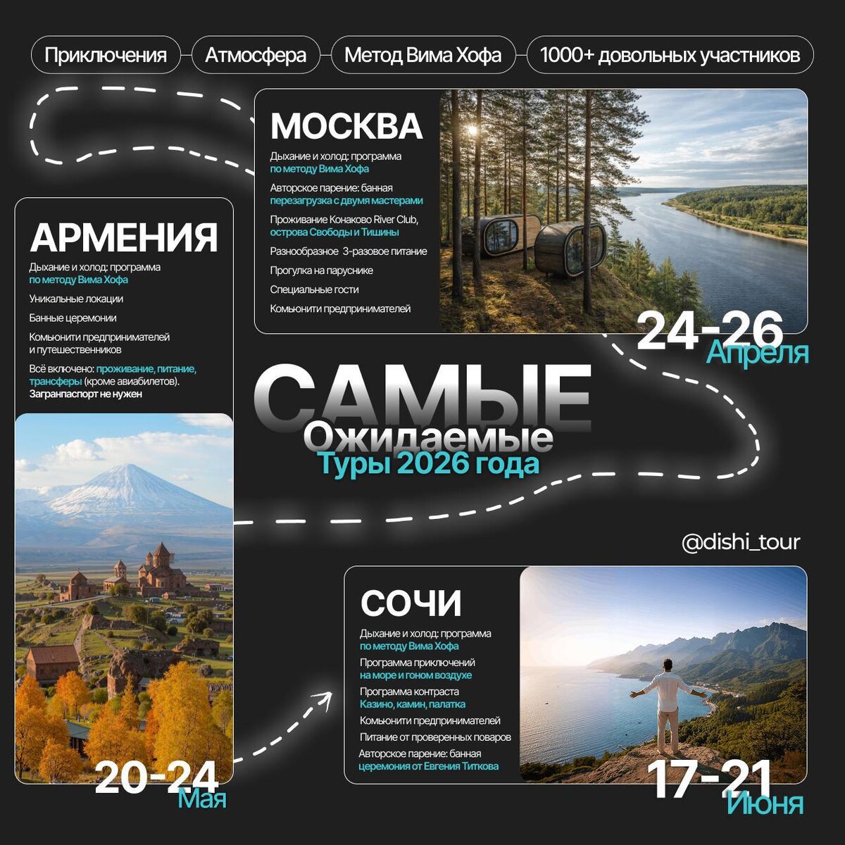 ! Приглашаем на три таких разных ретрита, но одинаковых нашей заботой и участием Алексея Мальцева и Евгения Титкова 24-26 апреля Остров на Волге, в 2х часах от Москвы. Конаково river club. Метод, 2 банные программы, тишина сосен, парусники и вид на просторы из панорамного окна лоджа. Бизнес-тур https://dishitour.ru/retrit_volga 20-24 мая. Красочная Армения. Ереван, Севан с панорамной баней, экстрим-парк, экскурсии и трекинг. Рекордное количество постоянных гостей - заряжено по взрослому! https://dishitour.ru/retrit_armeniya 17-21 июня. Горный Сочи. Прекрасные коттеджи, много трекинга, программа приключений и контрастов. Встреча Солнцестояния. Знакомство с коммьюнити Красной поляны. Самый доступный из ретритов https://dishitour.ru/retrit_sochi