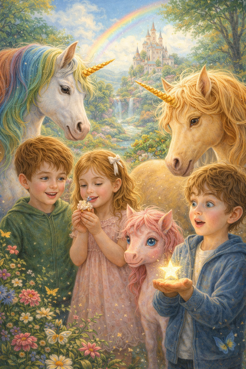 И тут с радостным ржанием к ним прискакали единороги — белоснежный Облачко, золотой Лучик и розовая Ягодка.