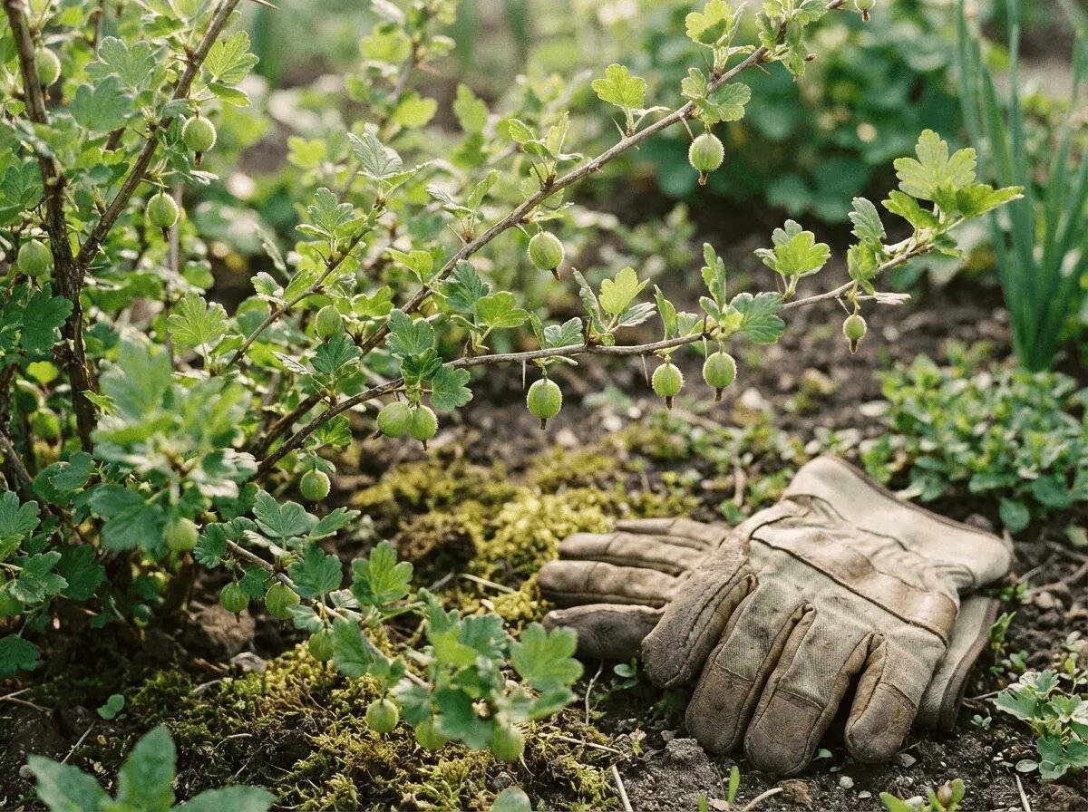 У крыжовника репутация скандалиста. Колючки злые, мучнистая роса липнет как проклятие, в загущённый куст вообще не влезть без потерь для рук. Но вот что интересно: при минимальном правильном уходе крыжовник плодоносит десятилетиями и урожай даёт стабильный. Один куст — и ягод хватает на варенье, компот и поесть свежими. У меня он растёт на участке и особых хлопот не доставляет. Главное — не запускать. Весной крыжовник нужно обрезать первым из всех кустарников. Он просыпается рано, и если опоздать с обрезкой, почки уже распустятся — работать будет неудобно, да и стресс для куста больше. Принцип обрезки примерно тот же, что у смородины: убираем старые ветки (старше 6–7 лет), убираем всё, что растёт внутрь и вниз. Крыжовник не любит загущение — в плотном кусте сразу поселяется мучнистая роса. После обрезки куст должен выглядеть легко и открыто. Примерно 6–8 разновозрастных веток — достаточно. Только не забудьте про перчатки. Плотные, кожаные. Иначе руки будут выглядеть как после встречи
