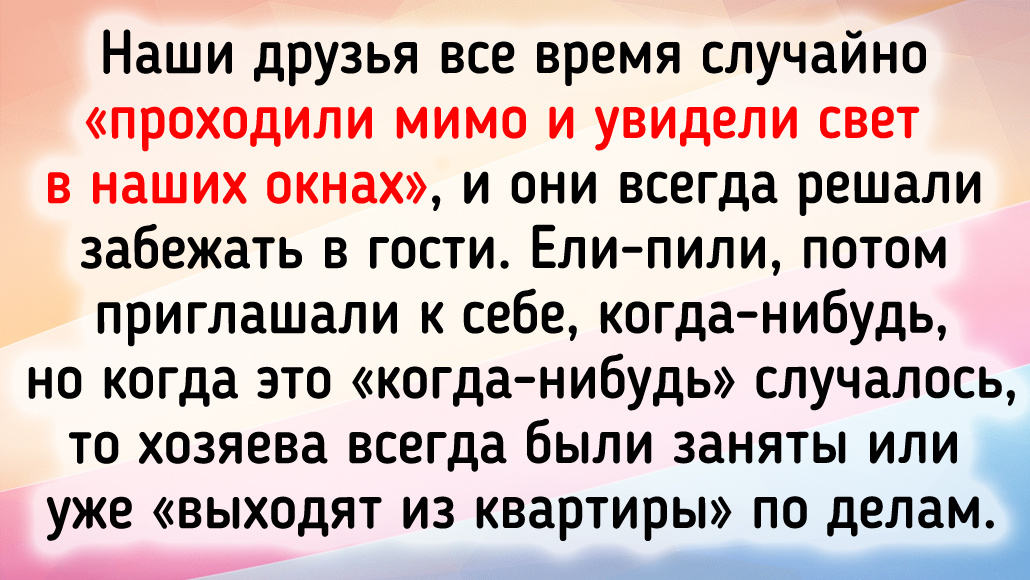 Наши друзья все время случайно «проходили мимо и увидели свет в наших окнах», и они всегда решали забежать в гости. Ели-пили, потом приглашали к себе, когда-нибудь, но когда это «когда-нибудь» случалось, то хозяева всегда были заняты или уже «выходят из квартиры» по делам. © Марина Осипова.
