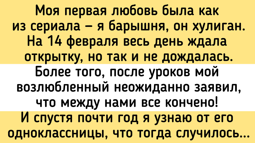 Моя первая любовь была как из сериала — я барышня, он хулиган. На 14 февраля весь день ждала открытку, но так и не дождалась. Более того, после уроков мой возлюбленный неожиданно заявил, что между нами все кончено! И спустя почти год я узнаю от его одноклассницы, что тогда случилось. Встретились мы совершенно случайно, поболтали, и под конец она посетовала, что мы были красивой парой и что я могла бы и извиниться, потому что поступила некрасиво. Я ничего не поняла. И она мне рассказала, что 14 февраля от моего имени пришла валентинка. Но не моему дражайшему, а его однокласснику. Одноклассник удивился, он был новеньким и меня не знал вообще. Мой любимка расстроился и решил расстаться. Гордость не позволила ему выяснять отношения, а почерк мой он не знал. Я до сих пор, пожалуй, не отказалась бы узнать, кто был автором той открытки и почему так поступил. © Sefinroth / Pikabu