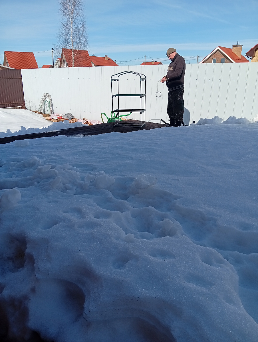 А вокруг все ещё снежная целина, которая тает очень медленно, я по возможности, откалываю куски снега лопатой и скидываю с подиума.