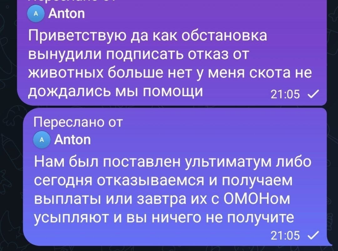 К ветерану боевых действий Антону Долженко из села Чернокурья в Новосибирской области, который приобрёл на выплаты по тяжёлому ранению скот, чтобы начать фермерское хозяйство, 15 марта пришли чиновники с силовиками и потребовали отдать животных. Также как и в случае с другими фермерами, чиновники не предъявили документов о болезни домашнего скота, и не взяли никаких анализов. Спустя неделю ветеран рассказал, что его угрозами расправы вынудили подписать отказ. Ему поставили ультиматум, что либо он добровольно отдаёт скот и получает минимальную компенсацию в виде подачек от властей, либо животных усыпляют с привлечением ОМОНа, и тогда он не получит ничего. "Вынудили подписать отказ от животных, больше нет у меня скота, не дождались мы помощи", – говорит Долженко. Человек, отдавший здоровье на войне, решил начать новую жизнь. Государство, для которого он воевал, отобрало у него эту жизнь под дулом ОМОНа. Как там говорил Путин? Новая элита? СВО. Итоги. 5-й год движухи.