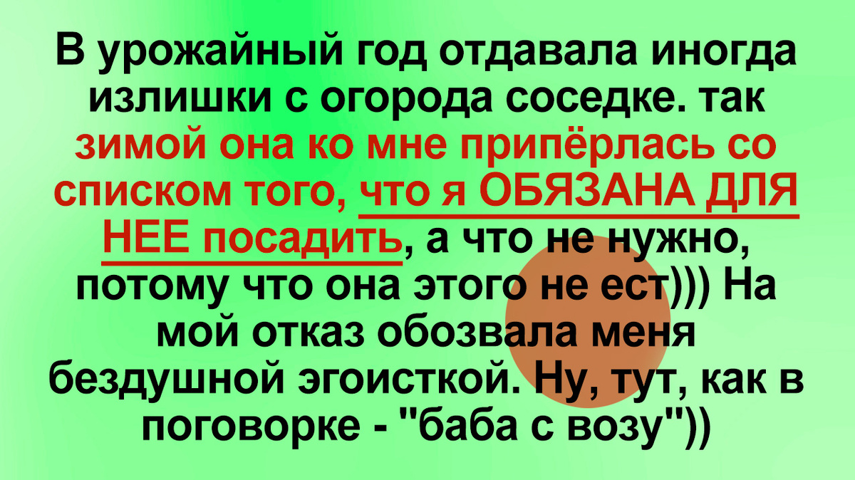 В урожайный год отдавала иногда излишки с огорода соседке. так зимой она ко мне припёрлась со списком того, что я ОБЯЗАНА ДЛЯ НЕЕ посадить, а что не нужно, потому что она этого не ест))) На мой отказ обозвала меня бездушной эгоисткой. Ну, тут, как в поговорке - "баба с возу"))