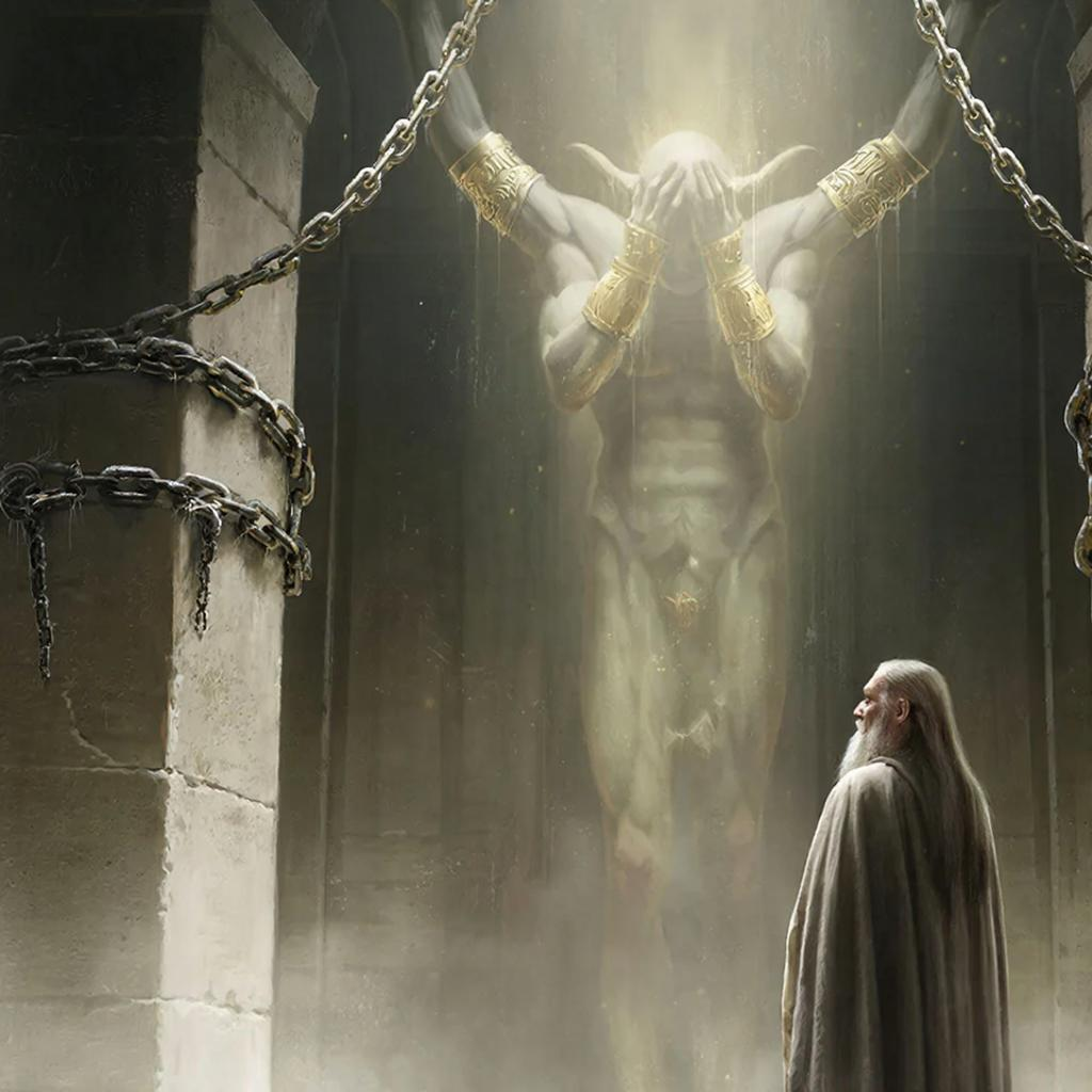 В сумрачном зале, где стены шептали древние тайны, а воздух дрожал от сдерживаемой силы, стоял Асмодей. Его фигура, окутанная мерцающим ореолом, казалась одновременно величественной и израненной. На запястьях поблескивали золотые браслеты, а тяжёлые цепи, словно живые, обвивали тело — не просто оковы, а часть его сущности. Напротив него, в простом облачении, с глазами, полными мудрости и сострадания, застыл Жрец. — Я не могу уже без образа цепей и оков… — голос Асмодея звучал глухо, но твёрдо. — Они как украшение моей сущности. Я не могу их снять, потому у меня приговор на вечно. Жрец поднял взгляд, в нём читалось неподдельное любопытство: