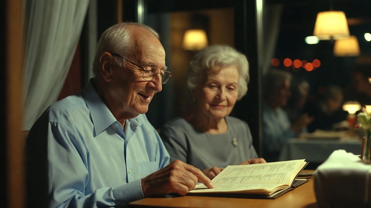 Пожилая пара в этот момент всё ещё изучала меню. Дедушка надел очки, водил пальцем по строчкам, иногда что-то зачитывал вслух бабушке. Та качала головой или кивала.