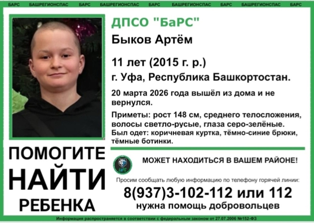 В Уфе обнаружили мальчика, которого считали пропавшим. Ранее об этом сообщала волонтерская группа «Башрегионспас». Как сообщили добровольцы, 21 марта в Уфе исчез мальчик. Он покинул дом и пропал. В описании были указаны его внешние признаки: рост 148 см, среднее телосложение, светло-русые волосы и серо-зеленые глаза. На мальчике были коричневая куртка, темно-синие штаны и темные ботинки. Сейчас ребенок найден, его жизни и здоровью ничего не угрожает. Место, где его обнаружили, не раскрывается.