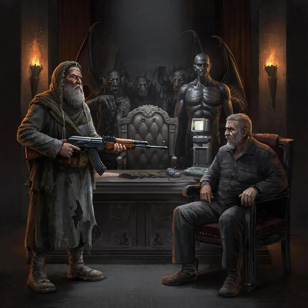 Дверь кабинета медленно отворилась, и на пороге возникла фигура, окутанная пылью веков. Это был афганский моджахед времён войны с СССР. Его одежда — потрёпанный паколь, выцветший жилет и шаровары — была покрыта слоем вечной грязи. Лицо, изрезанное глубокими морщинами, обрамляла густая, седая борода. Взгляд его был тяжёлым, полным горечи и упрямой, несгибаемой воли. Он не вошёл, а словно врос в пол, опираясь на воображаемый посох.