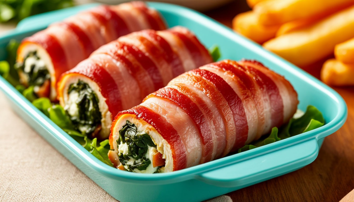 Выложите начинку на каждый пласт курицы, сверните плотным рулетиком. По желанию оберните полоской бекона — это и дополнительный вкус, и «замок», чтобы рулет не развернулся.