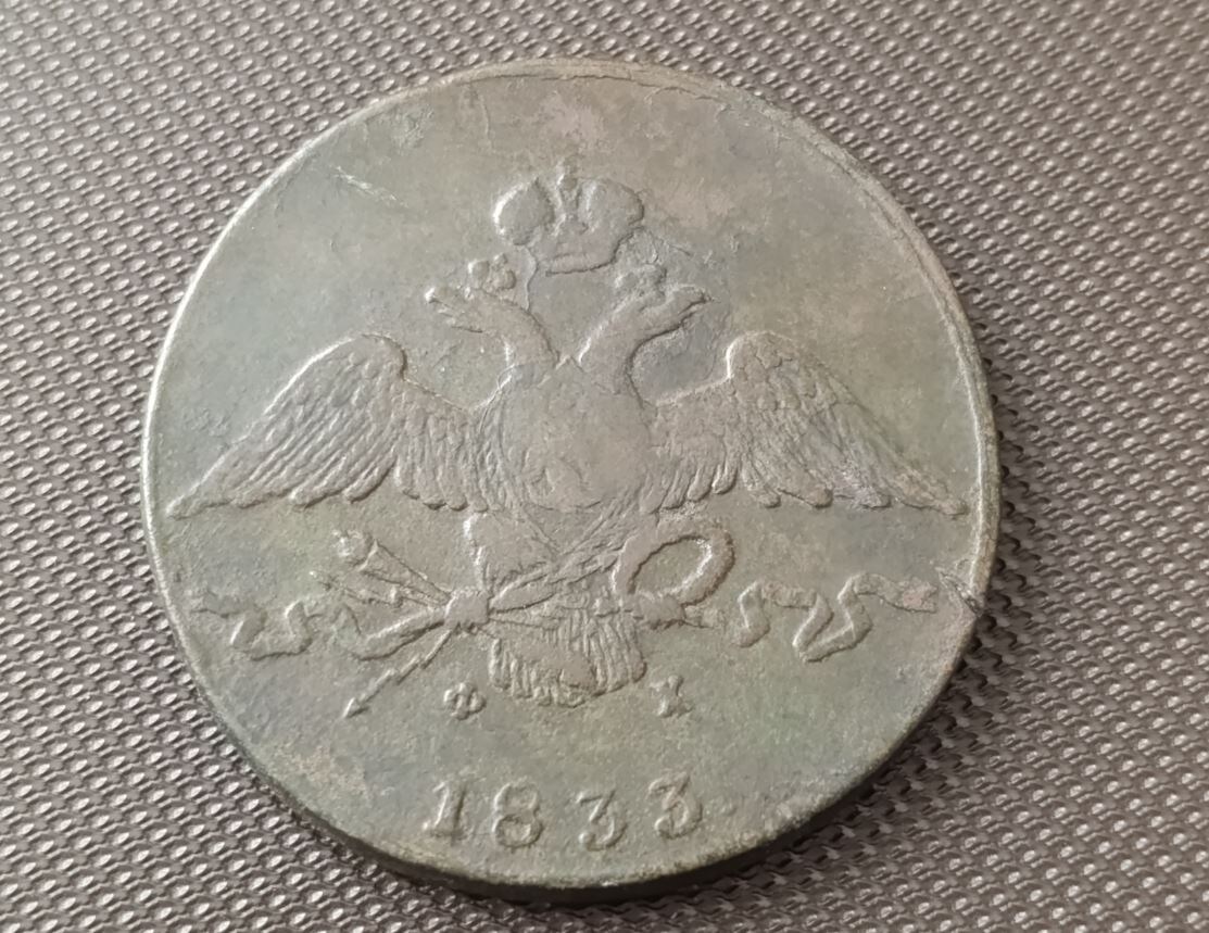 Хотел бы показать монету из своей коллекции. Она у меня одна без дублей. Но у таких монет редко бывают дубли, так как не каждый день встречается 10 копеек 1833 года: Мы легко можем прочитать, что монета отчеканена на Екатеринбургском монетном дворе (ЕМ), а буквы ФХ на аверсе являются инициалами Федора Хвощинского, который в то время был минцмейстером на Екатеринбургском монетном дворе. В каталогах можно найти информацию, что тираж данной монеты составляет 7 миллионов штук. Среди медных десятикопеечников эта монета относится к одной из самых массовых и недорогих. Но "недорогих" - понятие относительное. Всё же монеты этого типа вряд ли язык повернётся назвать распространенными. Цена по каталогу - 2000 рублей. Но это, конечно, уже устаревшая сумма, так как за последние несколько лет цены в сумме выросли "ого-го". Самый лучший вариант оценки - посмотреть, по каким ценам эти монеты продают сейчас. А вообще - самый-самый лучший вариант - смотреть, по каким ценам покупают. Для начала не