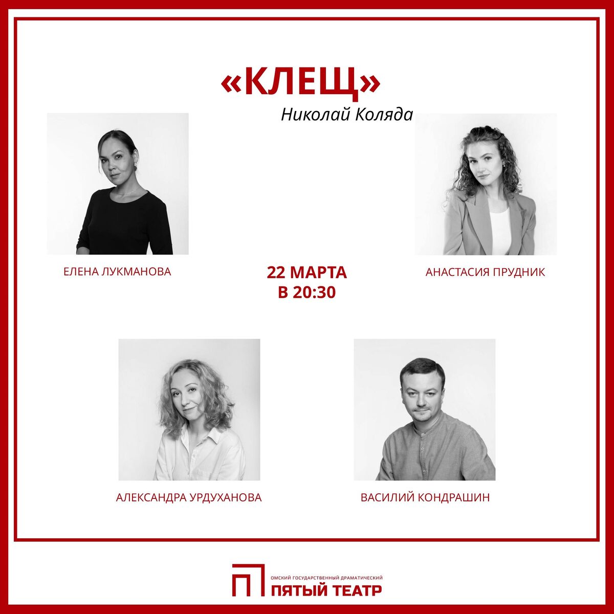 Читка пьесы Николая Коляды КЛЕЩ, посвящённая памяти драматурга, режиссёра и создателя Коляда-театра. Мероприятие проходит в рамках проекта Читаем в Пятом. Начало: 22 марта 2026 20:30 Стоимость: 350.0 руб. Адрес: г Омск, ул Красный Путь, д 153 к 1 Организатор: https://vk.com/public4362037 22 марта в 20:30 – читка пьесы «КЛЕЩ» 16+ по пьесе Николая Коляды. Неделю назад драматург, режиссёр и создатель «Коляда-театра» Николай Коляда ушел из жизни. Поэтому читка в рамках нашего проекта «Читаем в Пятом» посвящена именно ему. Имя Коляды связано с большинством российских театров (возможно и со всеми). Названия его пьес в репертуарах, имена его учеников на афишах, лауреаты и участники его фестиваля и Международного конкурса драматургов «Евразия-2025», режиссёрские... #искусство_и_дизайн_литература Узнать подробности, адрес или записаться на событие.