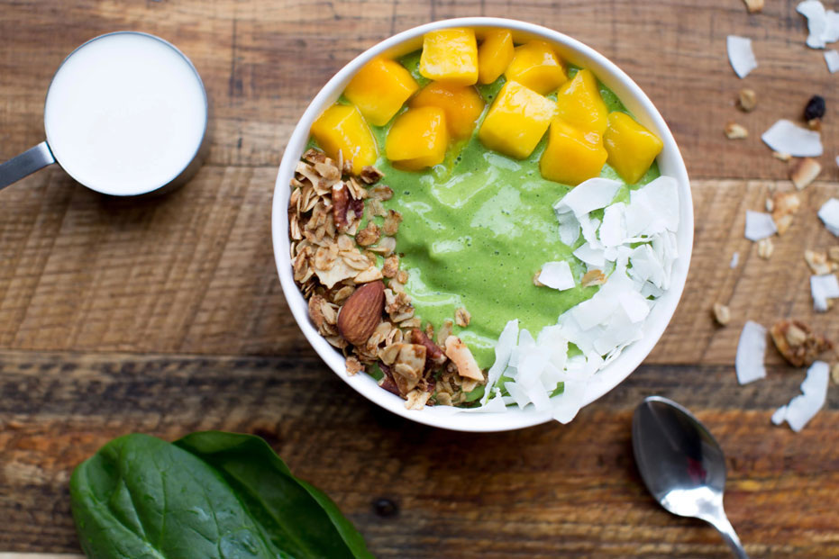 Бананы очистить, нарезать ломтиками и заморозить. Авокадо очистить, удалить косточку, нарезать кубиками и заморозить. Шпинат промыть, обсушить. Из половинки лимона выжать сок. Манго очистить, срезать мякоть, нарезать кубиками. Все ингредиенты, кроме манго и кокосовой стружки, сложить в блендер и измельчить до состояния пюре. При необходимости можно влить 30 мл растительного молока. Выложить пюре в глубокие тарелки и украсить кубиками манго и кокосовой стружкой. По желанию можно добавить орехи, горсть мюсли или ягод.