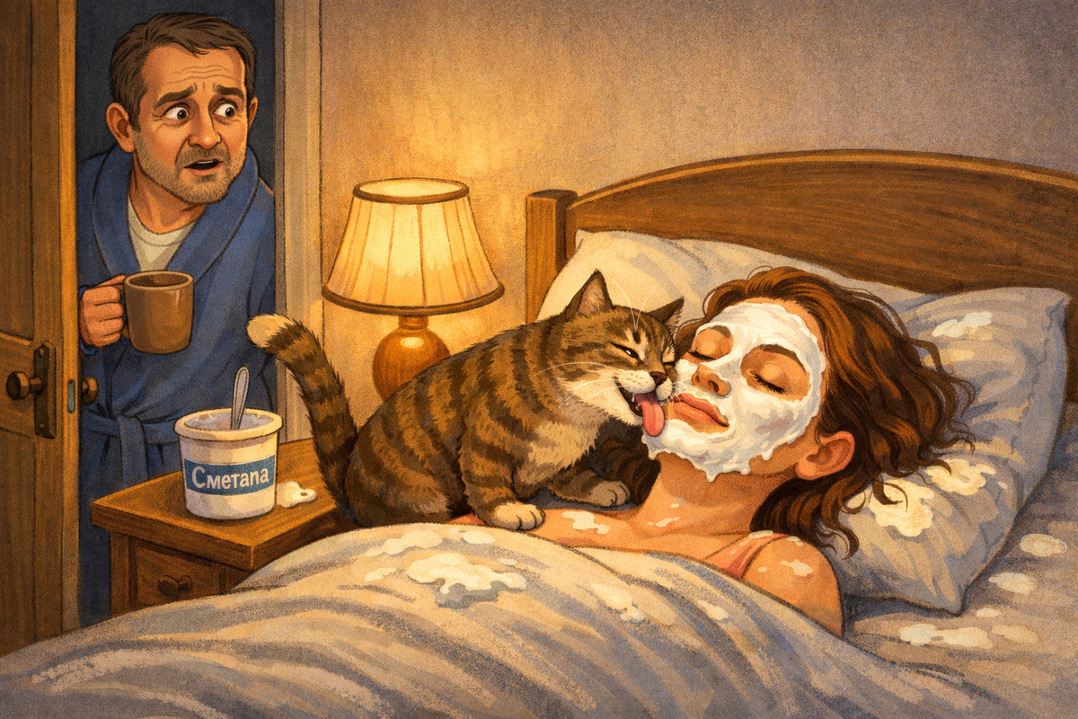 В жизни каждого человека есть особая мистерия, сокровенное таинство, именуемое «ревизия холодильника». Совершается это действо обыкновенно глубоким вечером, когда разум, утомлённый дневными заботами, теряет бдительность, а глаз, ведомый смутной надеждой на скорый ужин, скользит по стеклянным полкам. В этот момент время течёт иначе, прошлое встречается с настоящим, а человек предстаёт перед судом собственной забывчивости. Ибо нет в мире судьи более строгого, чем банка сметаны, задвинутая к стенке две недели назад. Женщина, назовём её Алёна, явила миру эту банку. Судьба сметаны свершилась: путь её лежал в мусорное ведро. Но тут вступил в силу великий закон «А вдруг пригодится». Жалко стало Алёне народных трудов, жалко продукта. И осенило её вдохновение. — Сметана-то кислая, — сообщила она мужу, Ивану, поправляя бигуди. — Для еды не годится. А для лица — самое то. Кожа засияет. Иван, смотревший футбол и не ведавший о грядущих испытаниях, лишь кивнул, так как сила женской логики сродни си