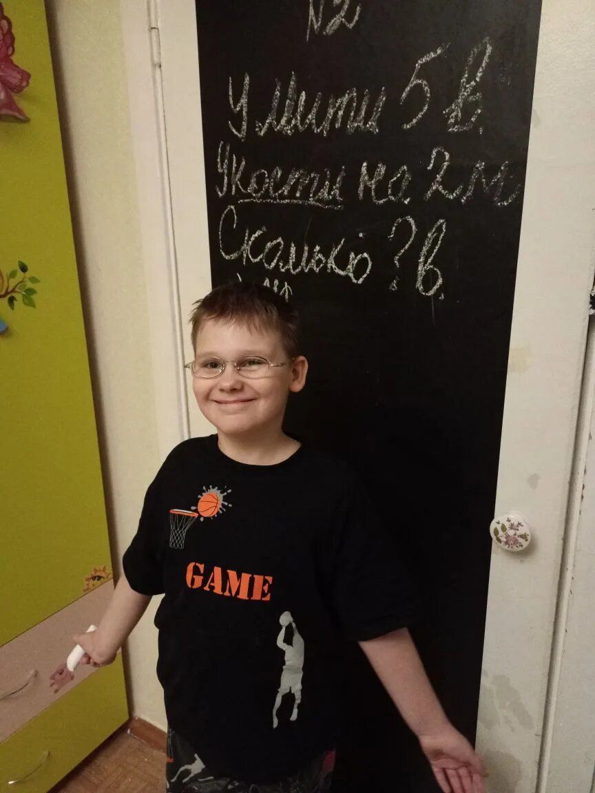 Поэтому мы теперь делаем уроки иначе. Я купила самоклеящуюся плёнку под меловую доску — матовую, как настоящая школьная доска, на которой пишут мелом. И наклеила её прямо на дверь. Теперь у нас своя доска для занятий.