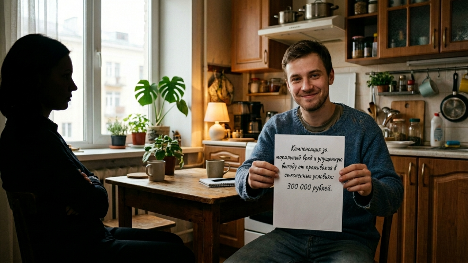 "Компенсация за моральный ущерб и упущенную выгоду от проживания в стесненных условиях: 300 000 рублей".