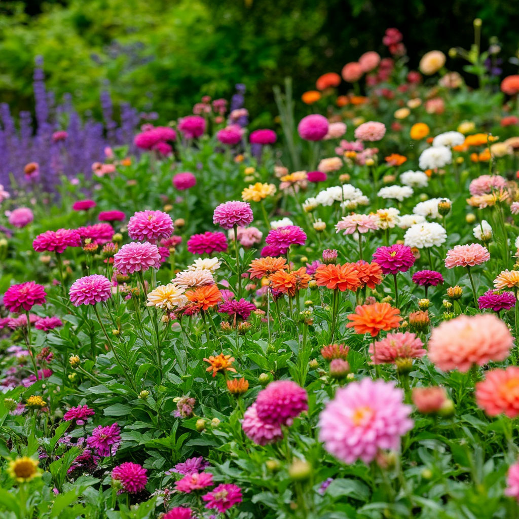 Яркие пятна на клумбе помогут создать циннии. Это настоящие трудяги: они стоят в срезке до двух недель и не теряют яркости на солнце. Циннии любят тепло и свет, но к составу почвы совершенно нетребовательны. Им нужен регулярный полив, но без застоя воды. Огромный плюс — они не болеют, если лето сухое, и растут очень быстро.