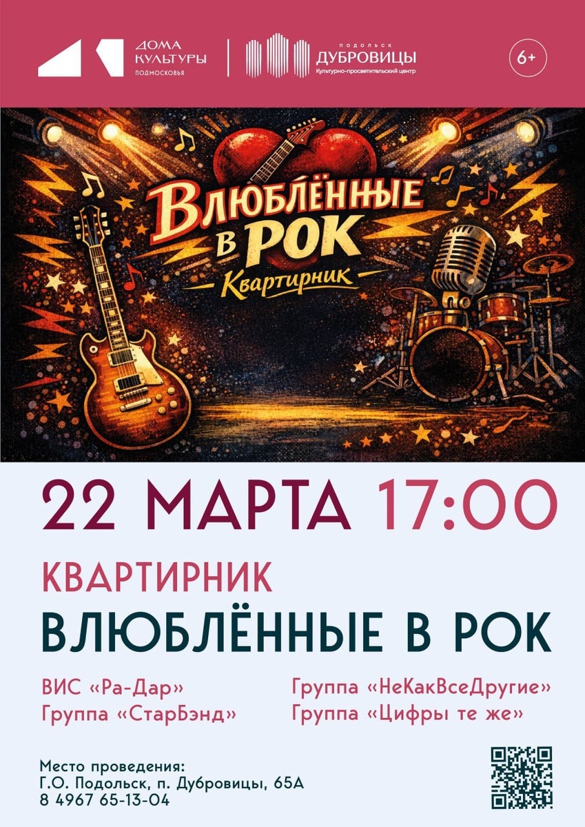 ✨ Квартирник «Влюблённые в рок» На сцене для вас выступят: ⏺ ВИС «Ра-Дар» ⏺ Группа «СтарБэнд» ⏺ Группа «НеКакВсеДругие» ⏺ Группа «Цифры те же» ⏳ Продолжительность - 2 часа 💳 Билеты в кассе Центра 🚫 Возраст: 12+ 📆 22.03.2026 🕒 17:00 🏢 Культурно-просветительский центр "Дубровицы" 📍 г.о. Подольск, поселок Дубровицы, д. 65А 💰 Цена: 300 ₽ ⭐Поддержать канал голосом 🍰Где поесть в Подольске ✅ Мероприятия Подольск https://dzen.ru/id/66ed500f7b5671493eca3fd6 https://vk.ru/podolsk_events http://dzen.ru/podolsk_events