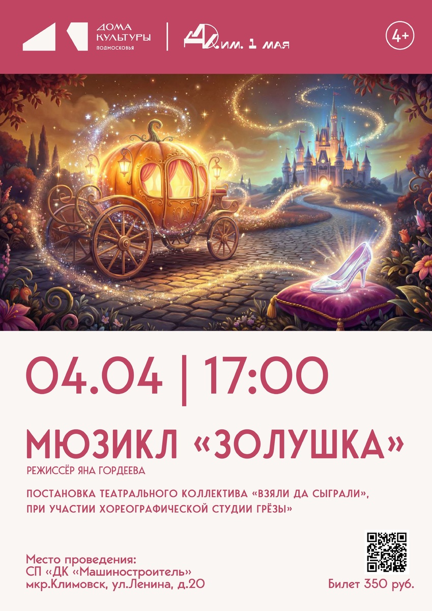 ✨ Музыкальный спектакль «Золушка». Премьера! 🎭Постановка театрального коллектива «Взяли, да сыграли», с участием хореографической студии «Грёзы». 👸Авторские музыкальные композиции и тексты, яркие декорации и великолепные голоса. 🫶Приходите 🚫 Возраст: 3+ 📆 04.04.2026 🕒 17:00 🏢 ДК "Машиностроитель" 📍 г.о. Подольск, мкр-Климовск, ул. Ленина, 20 💰 Цена: 350 ₽ 🔗 Купить билет: clck.ru/3SLrww ⭐Поддержать канал голосом 🍰Где поесть в Подольске ✅ Мероприятия Подольск https://dzen.ru/id/66ed500f7b5671493eca3fd6 https://vk.ru/podolsk_events http://dzen.ru/podolsk_events