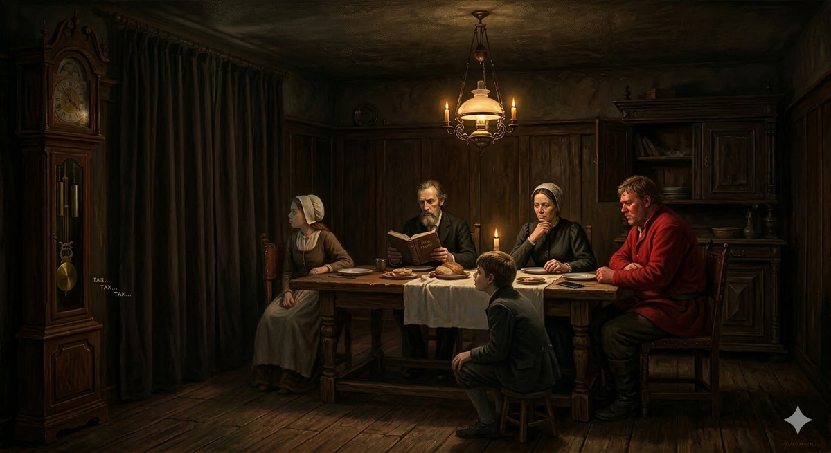 (На сцене полная темнота. Слышен только мерный, тяжелый стук маятника: ТАК... ТАК... ТАК…). Свет постепенно набирает силу, ярче подсвечивая стол и сидящих за ним.
