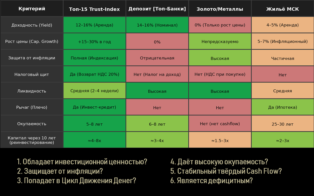 Стоит через 5 лет: 110 млн рублей: индексация и дефицит земли. Инфраструктура вокруг растёт. Появилось метро, дороги, жилые массивы. Теперь это единственный "склад последней мили" для района. Работает индексация аренды по инфляции на ежегодные +7+10%. Чистый операционный доход становится двузначным. Качественная инженерия позвол
