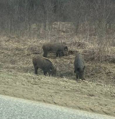 Спокойно добывают еду дикие кабаны у самой обочины дороги. И даже не шелохнулись. 😁😉