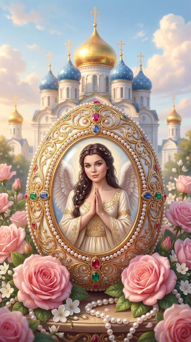 Работа участника нашего конкурса. Фэнтезийная сцена в стиле роскошной пасхальной открытки. Большое декоративное яйцо Фаберже с изящным золотым орнаментом, жемчугом и драгоценными камнями. В центре яйца овальное окно с портретом человека (использовать лицо с загруженной фотографии). Человек изображён в виде нежного ангела: маленькие белые крылья за спиной, руки сложены в молитве, мягкое доброе выражение лица. Сохранить реальные черты лица с исходного фото. Вокруг яйца лежат розовые розы и жемчуг, всё выполнено в очень детализированном стиле. На заднем плане красивый православный собор с золотыми куполами, голубое небо с мягкими облаками, солнечный свет. Атмосфера сказки, нежности и духовности. Стиль: ultra detailed, fairytale illustration, soft cinematic lighting, pastel colors, magical atmosphere, Fabergé egg style, depth of field, 3D illustration, high detail, photorealistic face Если тормозит Telegram, делаю в русском веб-сервисе gptunnel (промокод на скидку 75% PROMPT1_75 ) Есл