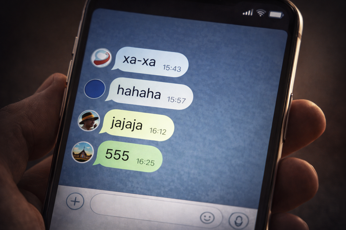 Испанский путь — совершенно другой. «Jajaja» — это чистая фонетика, точно так же, как русское «хахаха». Испанская «j» произносится как «х», поэтому «jajaja» — это буквально «хахаха». Никаких аббревиатур, никаких числовых кодов — прямая транскрипция звука.