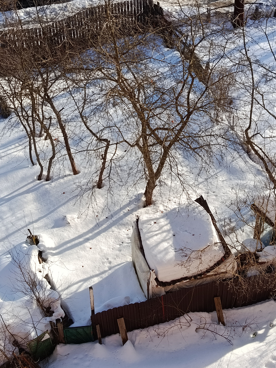 «Прогнулась под гнётом лежалых снегов – свернулась, уехав во внутренний мир» – сформулировала я состояние крыши сарайки под окном. И немного своё состояние с этими скачками температуры и давления.