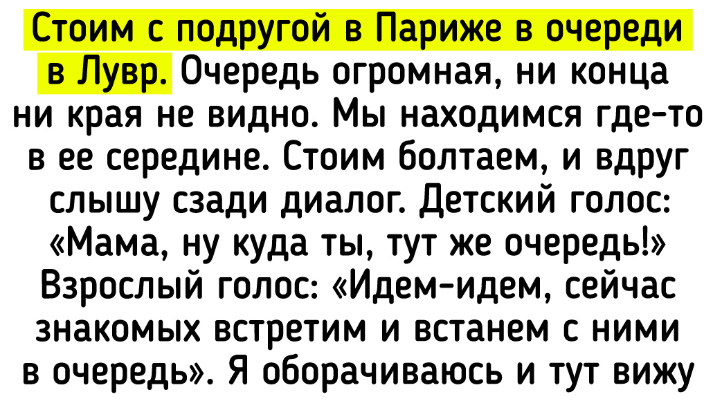 Я оборачиваюсь и вижу подругу своей тети из Алматы с сыном. Зову ее: «Тетя Дана, идите сюда». Она подходит, мы целуемся, обнимаемся, удивляемся, как мы умудрились встретиться в Париже. Так проходит пара минут, и она говорит: «Ну ладно, мы пошли, здесь еще очень долго стоять. Мы пойдем посмотрим, может быть, поближе ко входу еще кого-нибудь встретим и к ним встанем. Если не встретим, вернемся к вам». И самое забавное, что они не вернулись! Значит, действительно встретили еще кого-то знакомого в этой очереди! © SanDiegoCA / Pikabu
