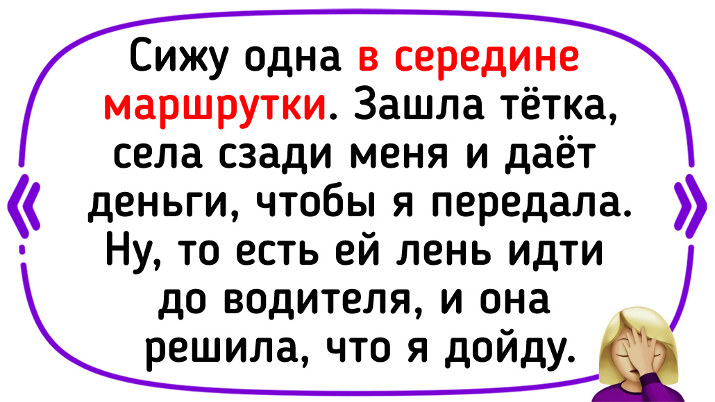 👉 Все эти истории из жизни рассказали читатели наших каналов на Дзене. Сижу одна в середине маршрутки. Зашла тётка, села сзади меня и даёт деньги, чтобы я передала. Ну, то есть ей лень идти до водителя, и она решила, что я дойду. © Ольга / Dzen Муж продавал свой Nissan Sunny в удовлетворительном состоянии родственнику на 30% ниже рынка для авто в таком состоянии. Все косяки честно рассказал, того всё устроило. Через 3 года началось: - В твоём авто сломалось одно. - В твоём авто отказало второе. - В твоём авто отвалилось пятое. - В твоём авто сгнило десятое. И требование отремонтировать… В общем, родственник 9 лет отгонял. И тут звонок: - Я твоё авто сегодня тебе верну. Возвращай деньги. © Voyager / Dzen Как-то ехали с дедушкой моим, стоя в автобусе. Вижу, недалеко место освобождается, говорю: «Иди садись, деда». Так он пока пробирался, какая-то яжемамка бегом на это место пристроила сыночку лет 17. Ну конечно, ему ж тяжело стоя, при том что сама она стояла. © Марина Медведева / Dzen П