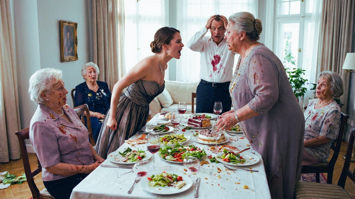 Пожилые женщины, грубо толкаясь и громко ругаясь между собой, начали неуклюже выбираться из-за стола, безжалостно размазывая остатки торта по дорогому паркету и светлой обивке дивана. Валера истошно кричал на мать, обвиняя её в бестактности и глупости. Нина Андреевна орала на сына в ответ, припоминая ему все его жизненные неудачи. Старушки громко и агрессивно требовали немедленной денежной компенсации за испорченные вещи. Гостиная превратилась в поле грязной, абсурдной битвы, где каждый искренне ненавидел каждого.