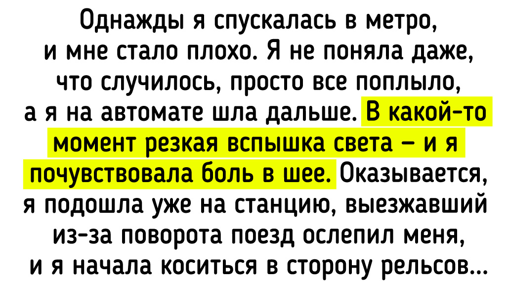 Однажды я спускалась в метро, и мне стало плохо. Я не поняла даже, что случилось, просто все поплыло, а я на автомате шла дальше. В какой-то момент резкая вспышка света — и я почувствовала боль в шее. Оказывается, я подошла уже на станцию, выезжавший из-за поворота поезд ослепил меня, и я начала коситься в сторону рельсов. Меня за рубашку сзади схватил мужчина и откинул назад. Этот мужчина просидел со мной на полу метро около часа, пока мой муж не подъехал. Денег он с нас не взял, хотя мы ему предлагали. © ushi_v_ushi