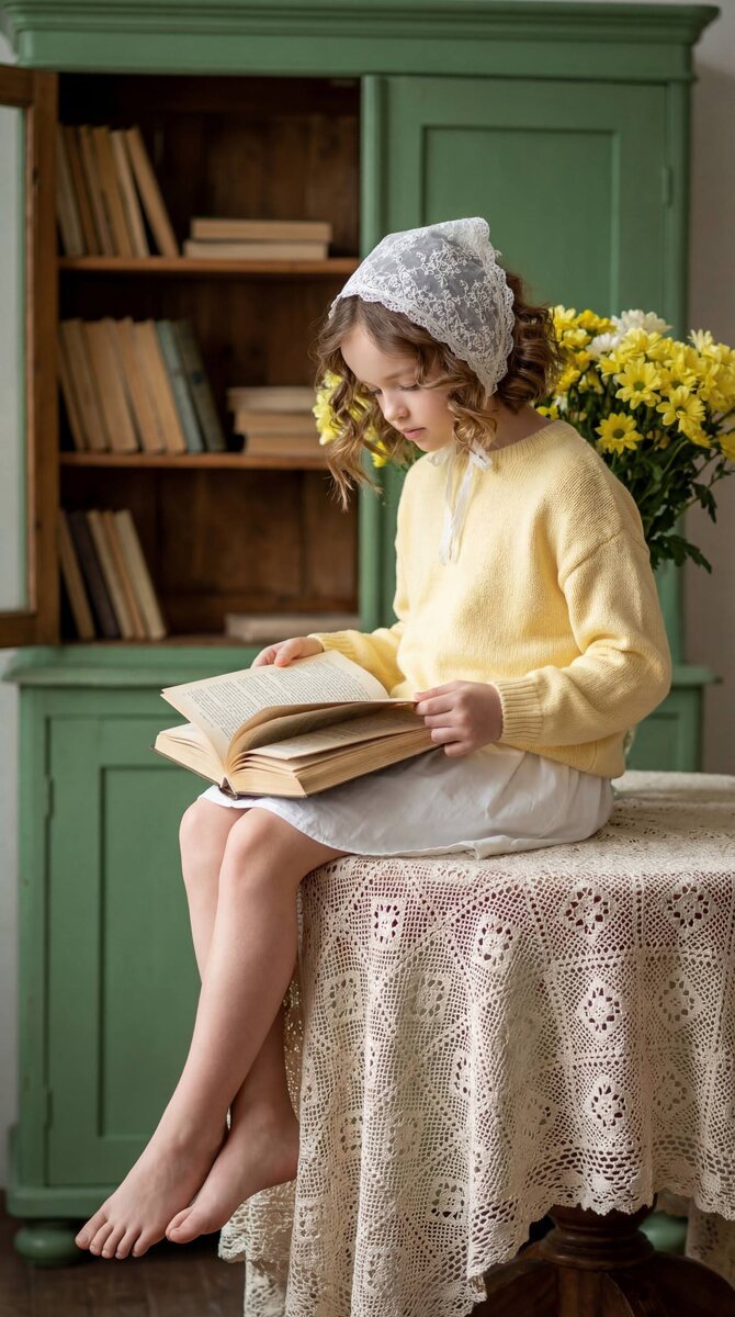 Девочка с книгой у зелёного шкафа и жёлтыми цветами
