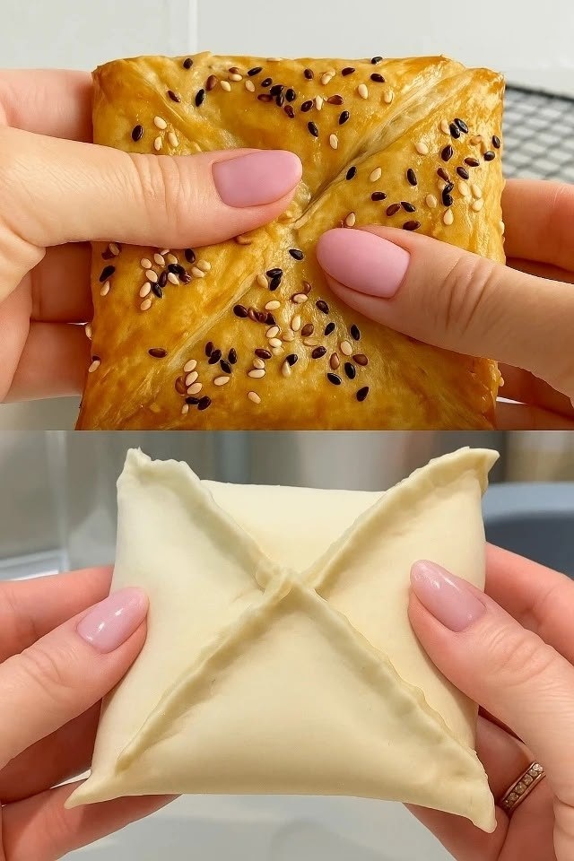 Эти хрустящие слоеные хачапури с нежной сырной начинкой покорят вас с первого укуса! Золотистая корочка, ароматный кунжут и тягучая сырная серединка - идеальное сочетание вкусов и текстур. А готовятся они так просто, что справится даже начинающий кулинар! Ингредиенты: 450 г слоеного теста 200 г сыра сулугуни 100 г творога 1 яйцо (белок для начинки, желток для смазывания) Щепотка соли Кунжут для посыпки Приготовление: 1. Натрите сыр на крупной терке, смешайте с творогом, яичным белком и солью. 2. Сформируйте 6 одинаковых шариков из сырной начинки. 3. Размороженное тесто слегка раскатайте, нарежьте на квадраты 14х14 см. 4. В центр каждого квадрата положите шарик начинки. 5. Края теста смочите водой, защипните, формируя аккуратные конвертики. 6. Выложите хачапури на противень с пергаментом швом вниз. 7. Смажьте желтком, посыпьте кунжутом. 8. Выпекайте при 200°C 15-20 минут до золотистого цвета.