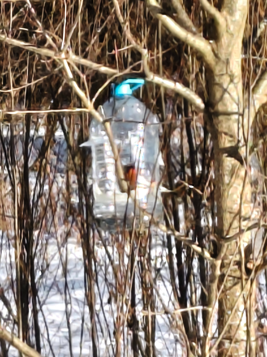 А птицы уже поют. В прошлый раз ещё лежал снег. На деревьях много подвешенных кормушек для птиц. Сделаны они из пластиковых бутылок. В бутылке вырезают небольшие отверстия по бокам, а дно усыпано семечками. Ещё и кусочек сала прикручен к ветке персонально для синичек. Я читала, что им для жизни необходим животный жир.