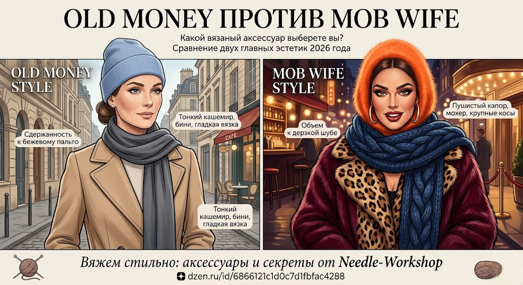 В 2026 году мир моды окончательно разделился на два лагеря. С одной стороны — Old Money, воспевающий «тихую роскошь», сдержанность и безупречное качество. С другой — дерзкая эстетика Mob Wife («жена мафиози»), которая требует объема, меха и максимального привлечения внимания. Как интегрировать вязаные аксессуары в эти полярные стили и что выбрать именно вам? Давайте разберем главные тренды сезона вместе с Needle-Workshop. Этот стиль строится вокруг классического бежевого пальто, кашемира и идеальных линий. Здесь аксессуар не должен «кричать» — он должен подчеркивать статус и уют. Что вяжем и носим: Если ваше сердце принадлежит объемным шубам (даже из эко-меха) и массивным украшениям, то Mob Wife — ваш выбор. Здесь аксессуар должен конкурировать с мехом по визуальному весу. Что вяжем и носим: Палитра: Глубокий винный, «полуночный синий» (Future Dusk) и, конечно, анималистичные принты, воплощенные в жаккарде. ДетальOld Money (к бежевому пальто) Mob Wife (к яркой шубе) ФактураГладкая