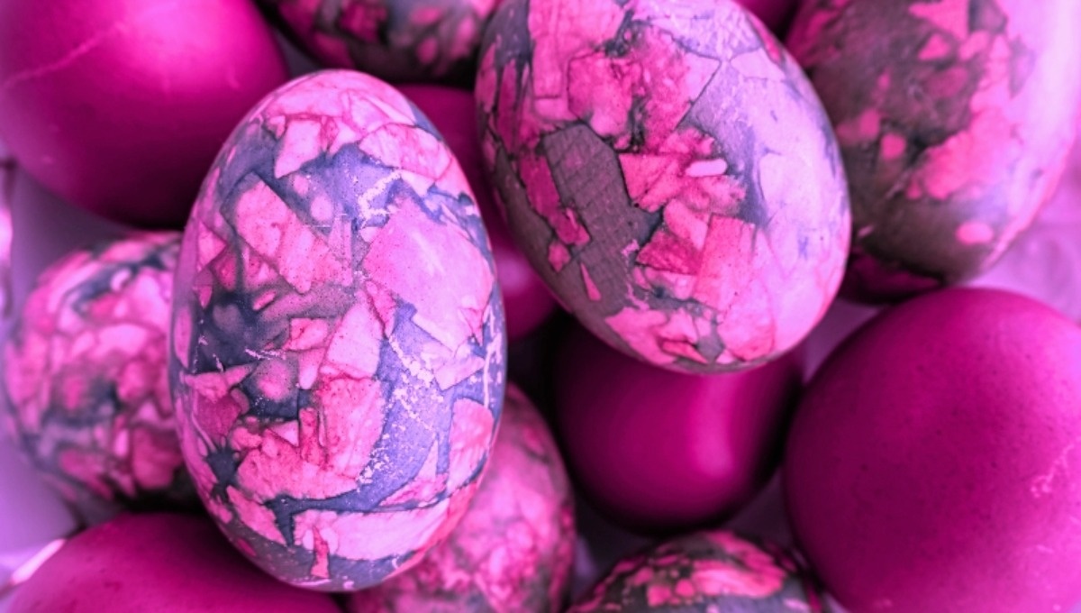 Достичь необычного эффекта просто. Меньше месяца остаётся до православной Пасхи, которая в этом году отмечается 12 апреля. Самое время подумать о том, как необычно окрасить один из главных символов праздника — пасхальные яйца. В последние годы всё более актуальными становятся натуральные красители в сочетании с интересными приёмами. Так, придать яйцам мраморную окраску в фиолетово-бронзовых тонах можно с помощью луковой шелухи, чая каркаде и белой бумаги. Рецепт прост: луковую шелуху и бумагу режут или рвут на мелкие кусочки. Готовят также куски марли по количеству яиц такого размера, чтобы можно было завернуть в них яйцо и закрепить ниткой. Белые сырые вымытые яйца обмакивают в воду, обваливают в смеси шелухи и бумаги, заворачивают вместе с налипшими кусочками в салфетку, фиксируют ниткой. В кастрюльку добавляют не менее 100 грамм чая каркаде на 6–8 яиц, заливают холодной водой, насыпают ложку соли, вливают ложку уксуса 9%, выкладывают яйца и варят, как обычно, 10 минут после закипани