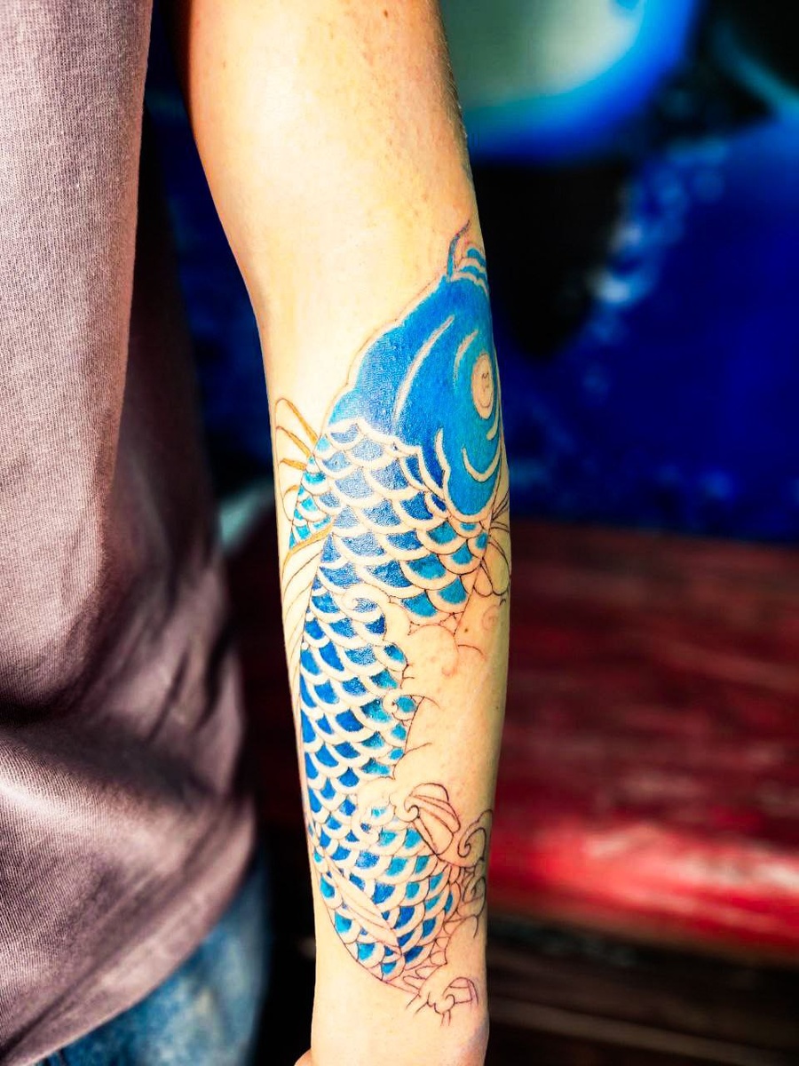 Давно хотел сделать такой проект — и вот представилась возможность. Клиент пришёл за рукавом. Начало положено: скомпоновал крупный элемент на предплечье, сделал разметку карпа и первый закрас. Продолжение следует.