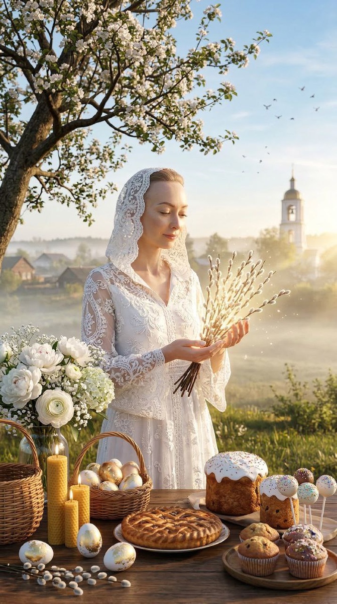Работа участника нашего конкурса. Снято на Canon высокопрофессиональная съёмка. Раннее утро Вербного воскресенья. На фоне пробуждающейся природы видна деревня, окутанная лёгким утренним туманом и золотистыми лучами солнца. В центре изображения — красивая женщина точь-в-точь с референса, макияж естественный, кожа блестит здоровьем, в белом роскошном кружевном балахоне с капюшоном, украшенном вышивкой, держит в ладонях пучок вербы — из его мягких серёжек исходит нежное реалистичное свечение, будто сама весна пробудилась в её руках. Вокруг неё — символы Пасхи: восковые зажжённые свечи ручной работы, дизайнерски расписаные яйца с цветной паталью в корзиночках, плетёные корзины, цветы на столе: белые пионы, ранункулюсы, гортензия и гипсофила стоят в плетёной вазе, много ароматных куличей, пироги с узорами, кексы и маффины с посыпкой, будто выпекали лучшие кондитеры, горячие булочки с посыпкой, кейк-попсы на палочках с посыпкой, стол богато накрыт полностью заполнен вкусностями, стоящи