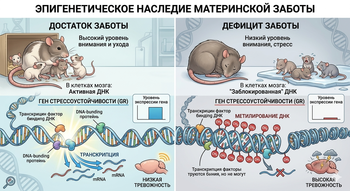Учёные доказали, что даже простой телесный контакт и забота в раннем детстве буквально «включают» или «выключают» определенные гены. Суть: на примере материнской заботы было показано: у тех, кто получал много внимания, гены стрессоустойчивости работали на максимум. У тех же, кто испытывал дефицит материнской заботы – эти гены были химически «заблокированы» (процесс метилирования). Вывод для нас: среда – это не просто фон, это химический сигнал, который говорит генам: «работай» или «молчи». Это исследование длилось 26 лет! Учёные наблюдали за группой детей от рождения до взрослости, изучая ген MAOA (его часто называют «геном агрессии»). Открытие: оказалось, что даже если у ребёнка есть генетическая предрасположенность к агрессии, она не проявляется, если среда вокруг него теплая и поддерживающая. Вывод для нас: благоприятная среда и правильное воспитание способны заблокировать негативную генетику. Эти работы (опубликованные в самых престижных научных журналах Nature и Science) доказываю