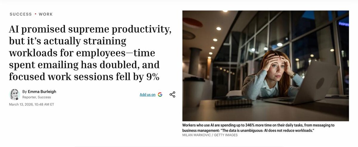 Из-за ИИ люди стали работать больше, а не меньше. Вместо свободного времени сотрудники начали получать больше задач. Время на почту и чаты выросло более чем в два раза, использование корпоративных сервисов — на 94%. Время на сосредоточенную работу, наоборот, сократилось на 9%. ИИ ускоряет выполнение задач, но рабочий день не сокращается. В итоге получается, что человек начинает работать в несколько раз больше. Количество реальных задач растёт. Помяните наше слово: скоро ещё ИИ начнут использовать для оценки эффективности и каждого действия человека, как это происходит в некоторых компаниях Китая. Сама по себе система без должной регуляции превращает работу в рабство. @lobushkin