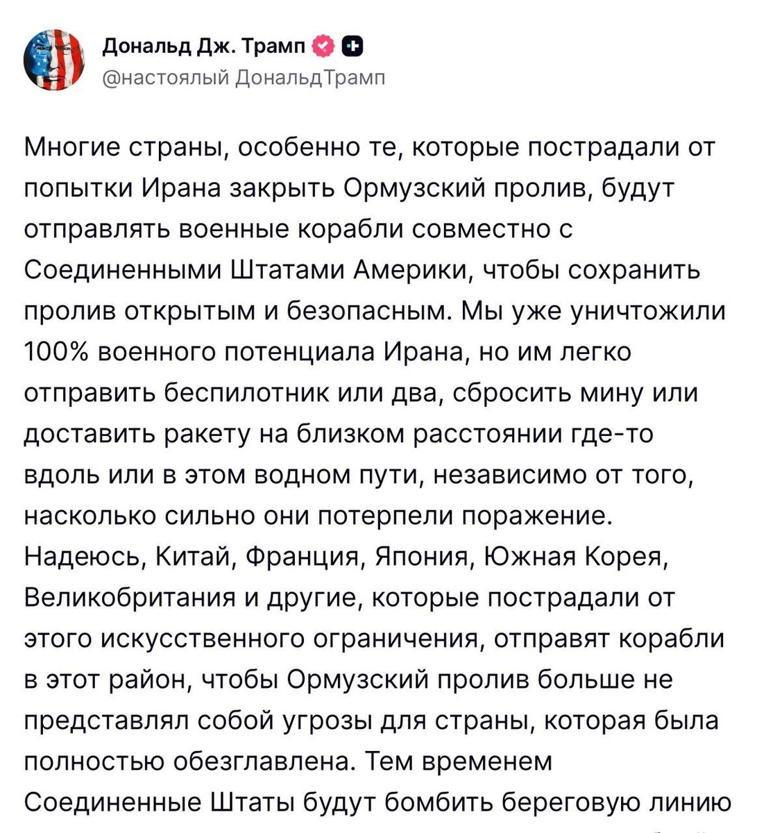 Президент США предложил другим государствам направить свои военные корабли в пролив, чтобы США могли и дальше наносить удары по Ирану. Trump hat China, Frankreich, Japan und andere Länder um Hilfe bei der Wiederherstellung des Schiffsverkehrs in der Straße von Hormus gebeten. Der US-Präsident hat vorgeschlagen, dass andere Länder ihre Kriegsschiffe in die Straße entsenden, damit die USA ihre Angriffe auf den Iran fortsetzen können.