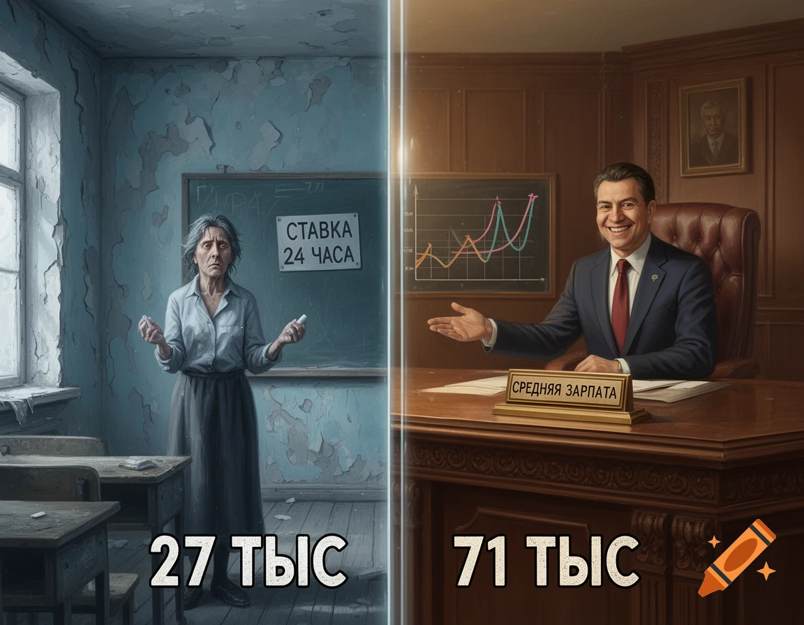Пока учительница из Омска встаёт в 5 утра, тащит 24 часа ставки, магистратуру и проверку тетрадей, Росстат рисует красивую картинку: педагоги в среднем получают 71 тысячу рублей. Врачи — 81 тысячу. И всё бы ничего, но средняя зарплата по стране — 140 тысяч. А в некоторых регионах учителям платят по 27 тысяч. И это даже не среднее, это реальность.