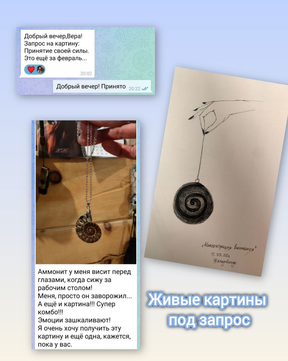 ?» Этот вопрос мне задают очень часто. Как ты чувствуешь? Как понимаешь, что именно нужно человеку? На самом деле всё происходит очень просто. Я закрываю глаза… и вижу образ. Иногда это цвет. Иногда символ. Иногда целая картина. Я беру карандаши и начинаю рисовать. Без логики. Без анализа. Просто доверяя тому, что приходит. Те, кто давно со мной, знают: я являюсь экспертом в закрытом клубе Портал Новой Реальности. И каждую неделю, по вторникам, любой участник клуба может поиграть с фортуной и выиграть мою живую картину. И знаете, какие запросы я люблю больше всего? Не «хочу денег». Не «хочу срочно результат». А когда человек приходит к самому себе. С вопросом о состоянии. О внутренней силе. О том, как услышать себя. Недавно был очень интересный случай. Человек сделал запрос, и я… даже не знала, где он живёт. Не видела его рабочее место. Не знала, чем он занимается. Я просто закрыла глаза. И увидела образ маятника. Состояние концентрации. Точку, в которой человек начинает
