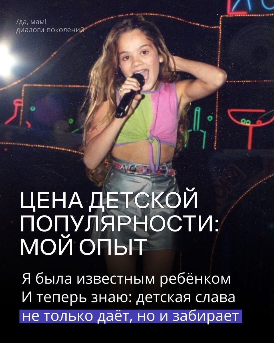 Мир детской славы, который со стороны кажется сказкой... Популярность действительно многое даёт: узнаваемость, полезные знакомства, ранний опыт работы и ощущение, что перед тобой открывается гораздо больше дверей, чем перед большинством сверстников. Но правда в том, что такая жизнь не только даёт — она многое и забирает. В этих слайдах я решила честно рассказать о своём опыте: чему меня научила детская известность и с чем пришлось столкнуться, когда аплодисменты вдруг закончились. Загляните — возможно, это поможет по-другому посмотреть на детский успех и на то, какой ценой он иногда достаётся. Что, по‑вашему, важно учитывать родителям, если ребёнок становится популярным слишком рано?