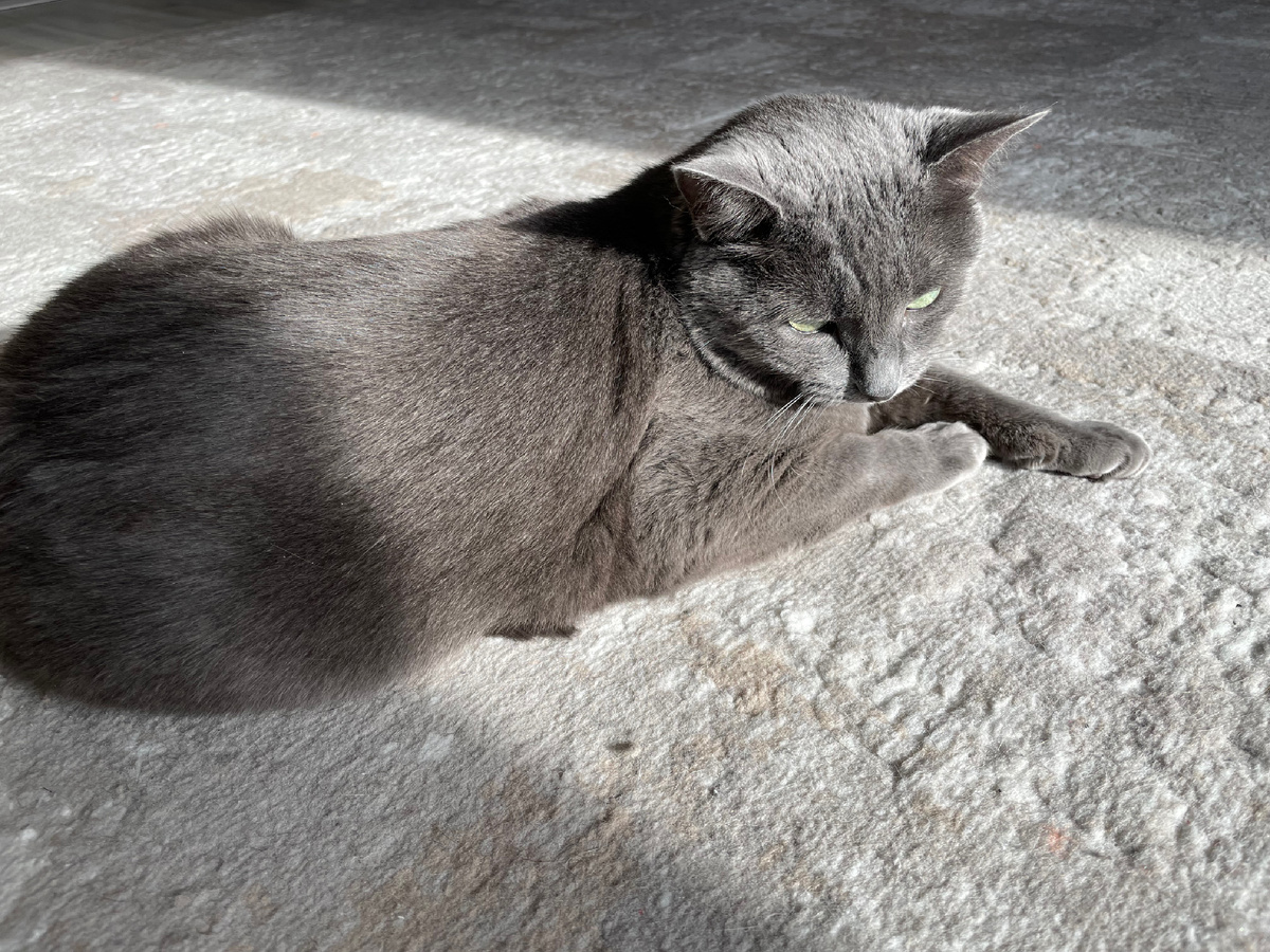 Кошка некоторое время полежала в холодной и некомфортной тени, а потом подняла голову и осмотрелась вокруг. Увидела светлое пятно рядом. Немного полежала, подумала и нехотя стала подниматься со своего места. Сделала пару шагов до него и снова осторожно и со знанием дела разместилась на полу.